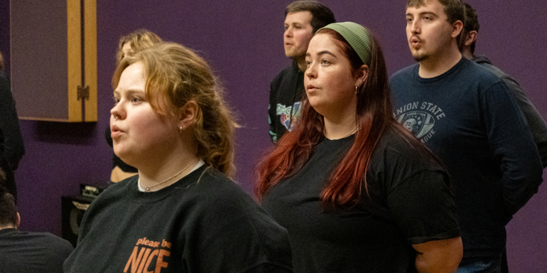Caroline Parker MBE led a participatory workshop that enabled students and staff to become more aware as to how to meet the access needs of Deaf and hearing impaired artists and audience members. This included learning how to begin the process of interpreting a song in sign language.