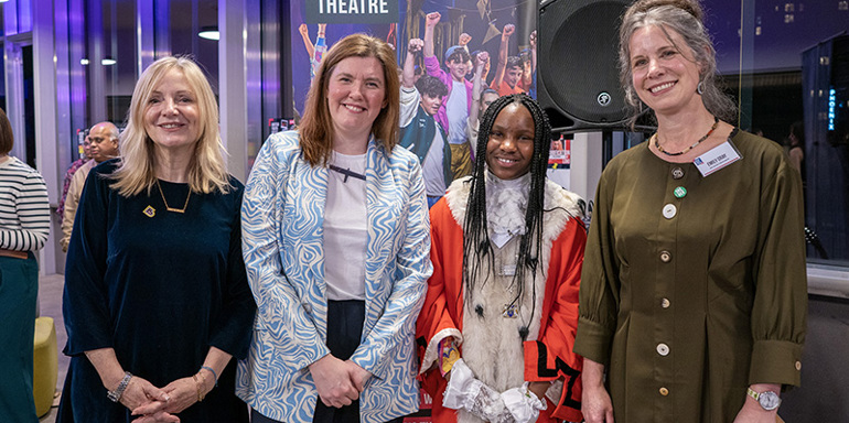 Pictured left to right: Mayor of West Yorkshire Tracy Brabin, LC Vice Principal Patsy Gilbert, Leeds Children's Mayor Esosa Ehioghae, BYMT Creative Director Emily Gray. Photo credit throughout: Ian Hodgson