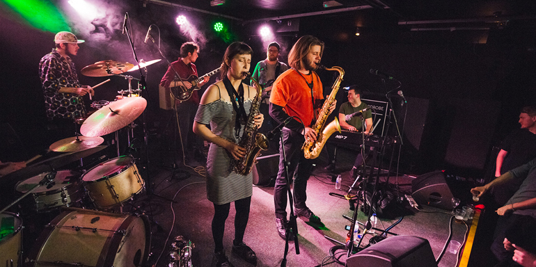 Têtes de Pois are rising stars of the Leeds Jazz scene and are supporting the incredible Soweto Kinch on Friday 20th of July at The Wardrobe. They are a seven-piece band made up of current LCoM students and alumni; Harry Fowler (Tenor Sax/ Vocals), Jasmine Whalley (Bari Sax), Ben Haskins (Guitar), George MacDonald (Keys), Owen Burns (Bass), George Hall (Drums) and Josh Ketch (Percussion). Lubi Jovanovic described them as a “genre-bending seven-piece instrumental band, fresh on the scene, mashing up hip-hop, afrobeat, soul, jazz and more” and this is certainly true.