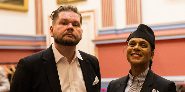 Joe Wilson pictured with Leeds Conservatoire Fellow Pauline Black, at Graduation 2018. Image credit: maskofstorrow