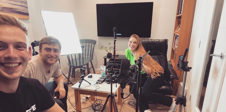 Will and Tristan recording an episode with their first industry guest, Grace George