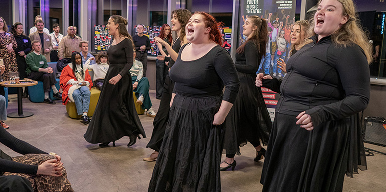 Guests included Mayor of West Yorkshire Tracy Brabin and Leeds Children’s Mayor Esosa Ehioghae. The evening included performances from BYMT alumnus and West End performer Luke Bayer (Everybody’s Talking About Jamie, original West End alternate Jamie) and 30 undergraduate students from the conservatoire’s Musical Theatre course, who performed numbers from BYMT favourites When We Strike and The Naughty Carriage on the Orphan Train.