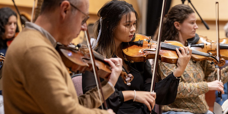 Violinists playing in The Venue at Leeds Conservatoire. Photo credit: Ian Hodgson